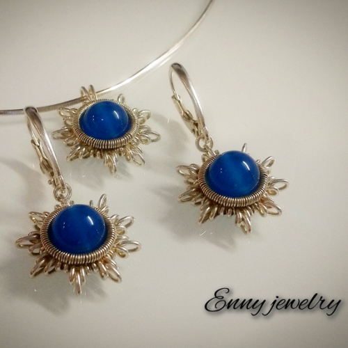 Strieborná drôtikovaná súprava “Kvietky“ s modrým Achátom
