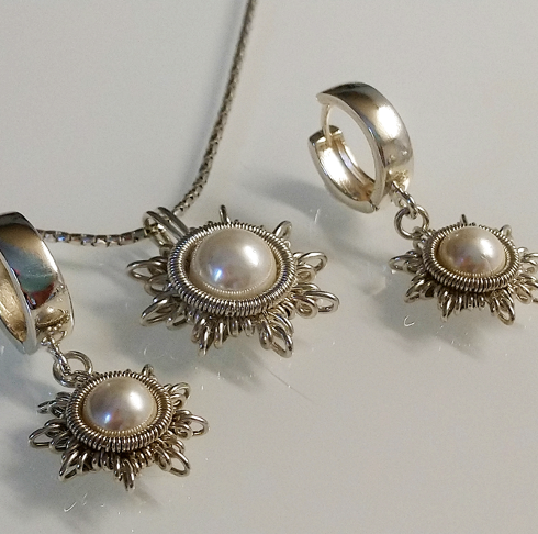 Strieborná drôtikovaná súprava “Kvietky” s perlovými korálkami