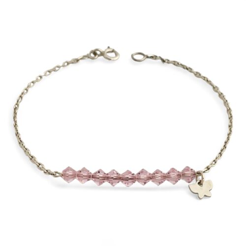 Strieborný náramok s ružovými korálkami a motýlikom.