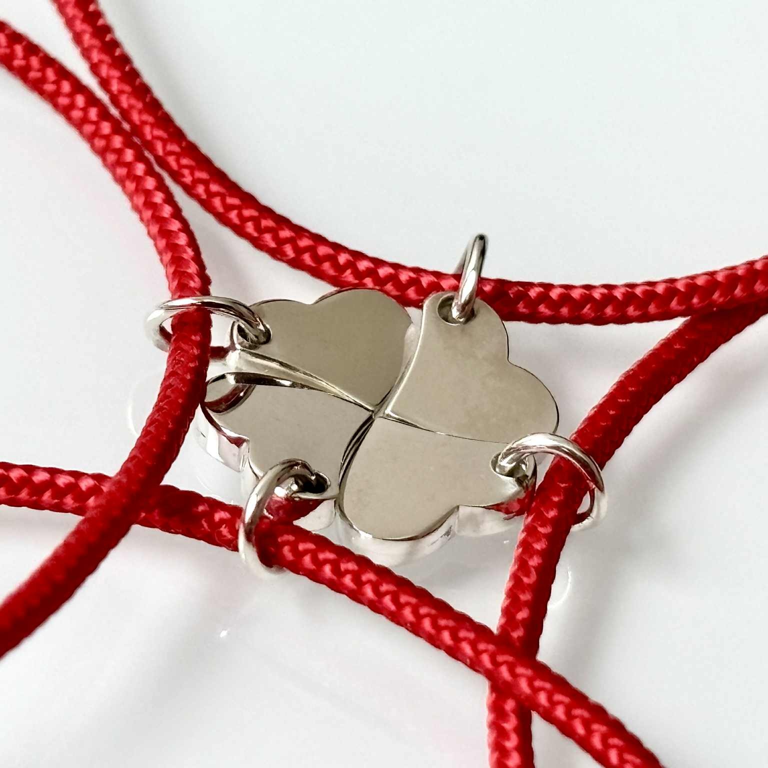 Každý náramok nesie ručne vyrobený prívesok zo šperkového striebra (rýdzosť 925/1000) v tvare srdca. Každé srdce je jemne zrezané tak, aby do seba zapadlo s ostatnými. A keď sa štyri spoja – vznikne štvorlístok.