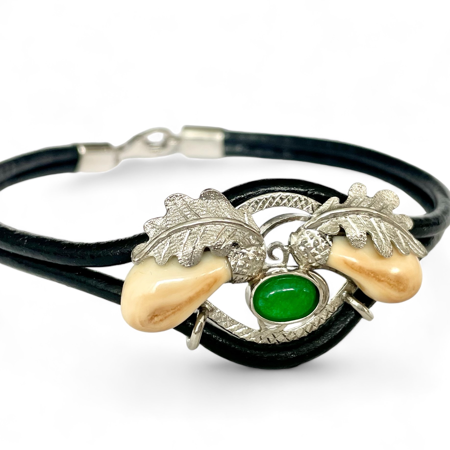 Poľovnícky náramok je vyrobený zo šperkového striebra 925/1000. V centre náramku je strieborná ozdoba, so striebornými obrubami v tvare žaluďa a dubovými lístkami, ktorú krásne dopĺňa kameň zelený achát.