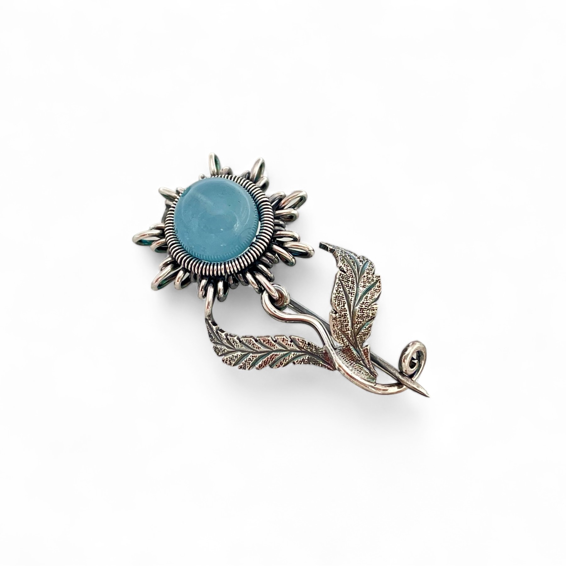 Naša strieborná brošňa je vytvorená s dôrazom na detail a kvalitu. Kombináciou drôtikovania a klasických zlatníckych techník sme dosiahli dokonalý tvar kvetu. Hlavička kvietku je vytvarovaná zo strieborného drôtu a v jej strede sa nachádza 0,8 cm veľká korálka z prírodného akvamarínu. Telo kvietku, jeho stonka, je rovnako zo strieborného drôtu, doplnená jemne vypílenými a gravírovanými lístkami, ktoré pridávajú šperku eleganciu a jemnosť