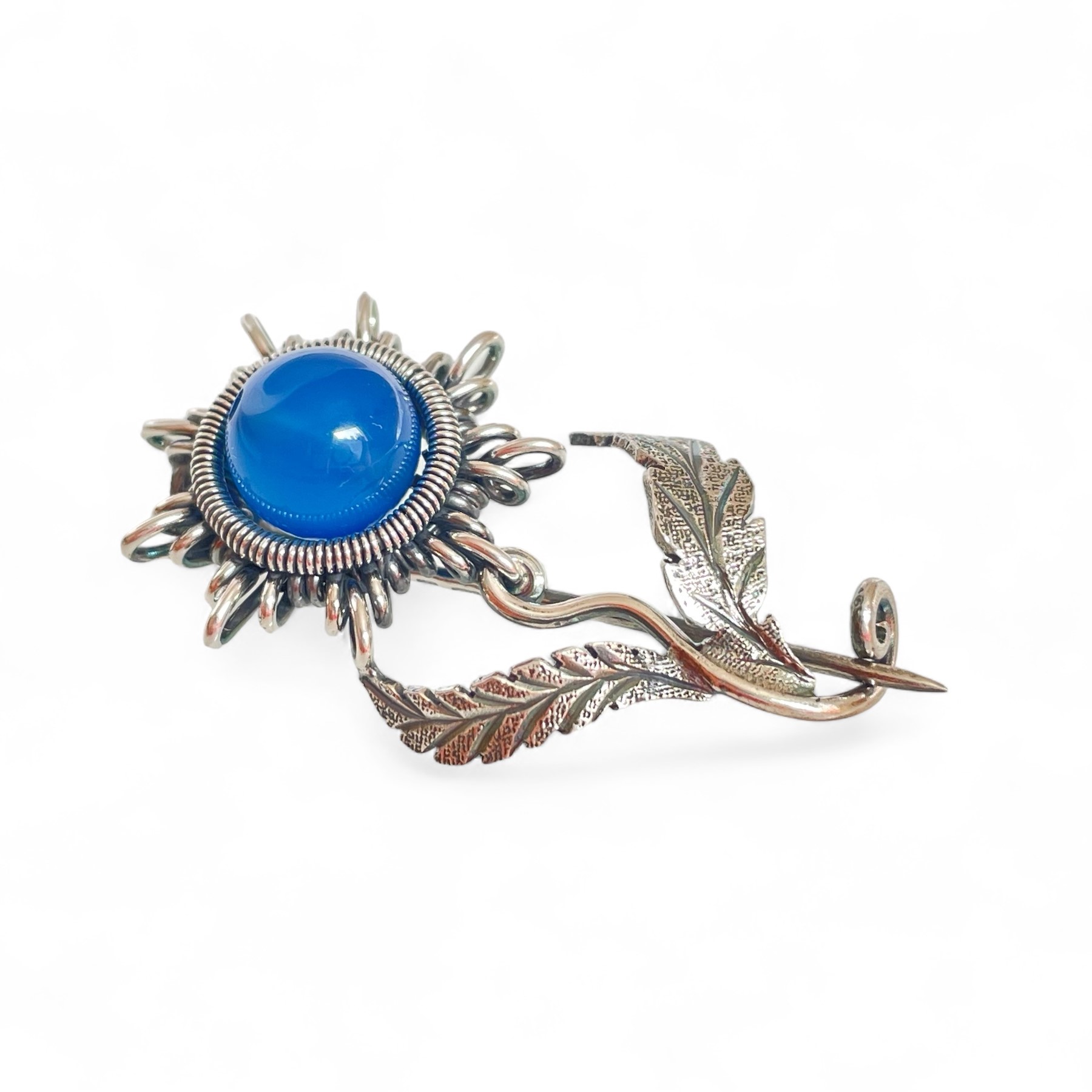 Naša strieborná brošňa je ručne vyrobená zo šperkového striebra (925/1000), ktoré zaručuje vysokú kvalitu a trvanlivosť. Jemné detaily brošne sú výsledkom kombinácie drôtikovania a klasických zlatníckych techník. Hlavička kvetu je precízne vytvarovaná zo strieborného drôtu a v jej strede sa nachádza nádherná korálka z modrého achátu o veľkosti 8 mm, ktorá dodáva šperku elegantný farebný akcent.
