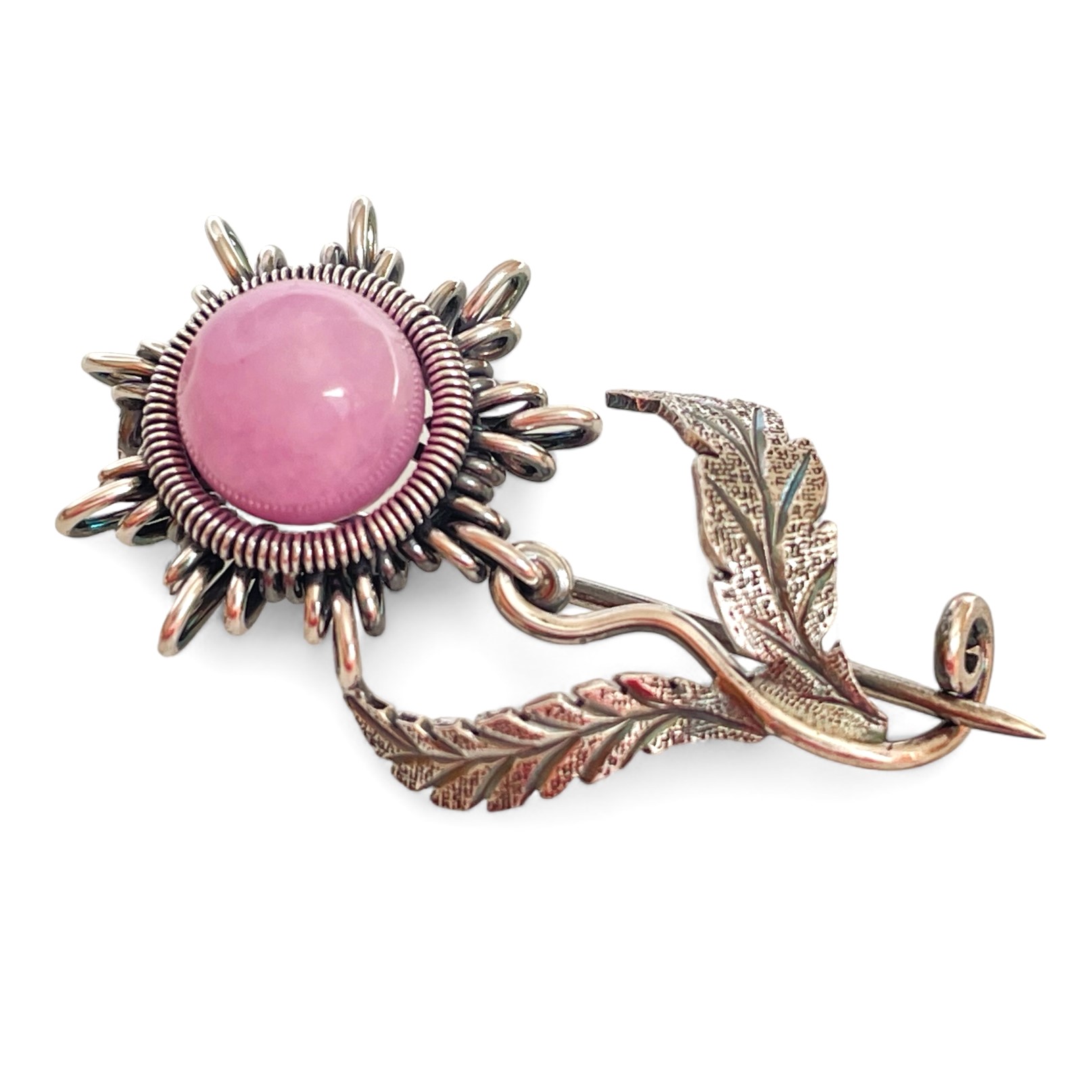 V srdci kvetinky sa nachádza podmanivý korálik ružového Angelitu. Hlavička kvetu je vytvorená technikou wire-wrapping (drôtikovanie), a tvorí jemný a zložitý dizajn, ktorý určite zaujme. Telo kvetu tvorí stočený a vytvarovaný strieborný drôt, ozdobený jemne vypílenými a gravírovanými striebornými lístkami.