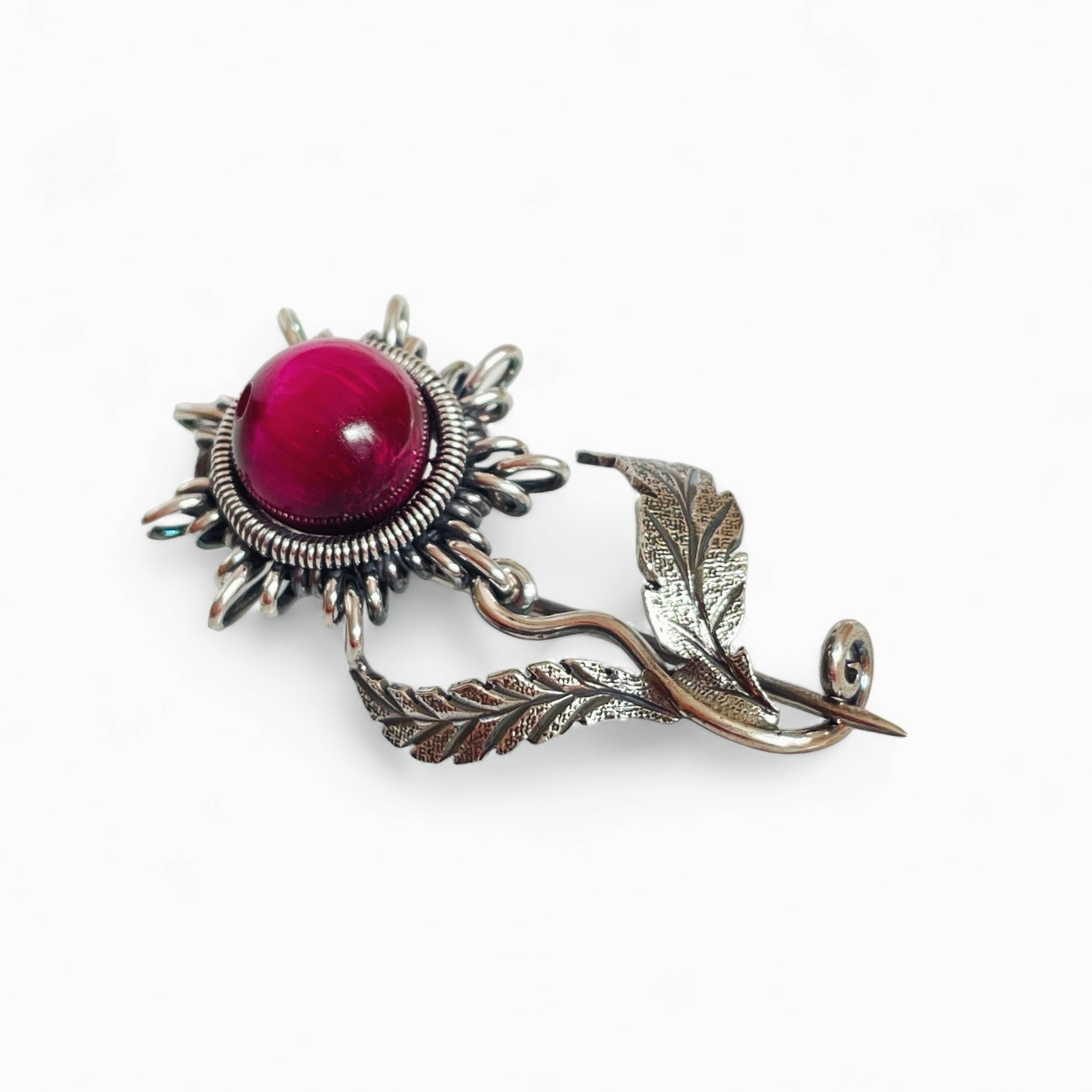 Naša strieborná brošňa je ručne vyrobená zo šperkového striebra (925/1000). Jemné detaily brošne sú výsledkom kombinácie drôtikovania a klasických zlatníckych techník. Hlavička kvetu je precízne vytvarovaná zo strieborného drôtu a v jej strede sa nachádza nádherná korálka z Tigrieho oka Magenta o veľkosti 8 mm, ktorá dodáva šperku elegantný farebný akcent.