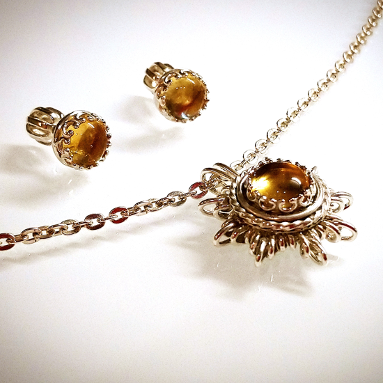 Táto žiarivá strieborná súprava, na ktorej sa trblietajú žlté prírodné Cítríny, je ručne vyrobená zo šperkového striebra s rýdzosťou 925/1000. Prívesok v tvare kvietku krásne dopĺňajú drobné Citrínové náušničky so zapínaním na šróbik (balónik).