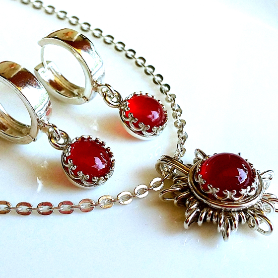 Táto prekrásna strieborná súprava náušničiek a prívesku, je ručne vyrobená zo šperkového striebra 925/1000 a prírodných Karneolov. Veľkosť kamienkov je 0,8 mm na prívesku a 0,6 mm na náušničkách. Súprava je vyrobená kombináciou drôtikovania s klasickými zlatníckymi technikami.