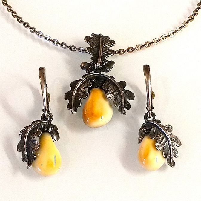 Strieborný prívesok a náušnice tvoria obruby v tvare žaluďa, v ktorých sú osadené jelenie grandle a sú zdobené dubovými lístkami.