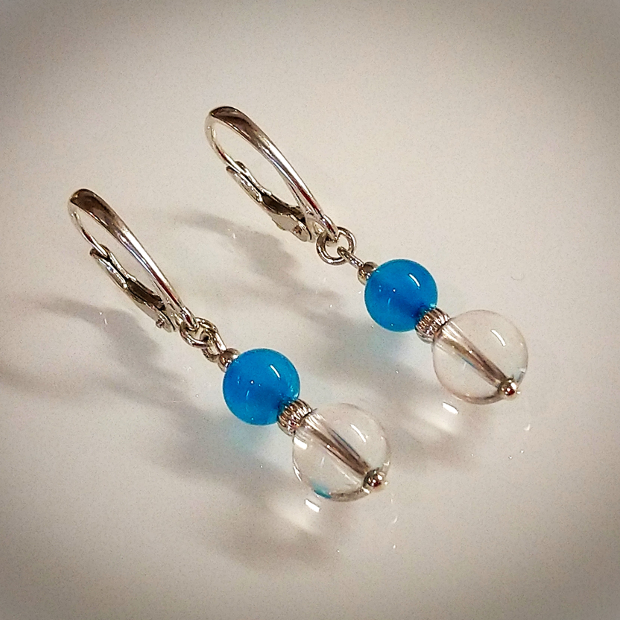 Strieborné náušničky sú ručne vyrobené zo šperkového striebra (925/1000) a z prírodných korálok z horského krištáľu a modrého Achátu.