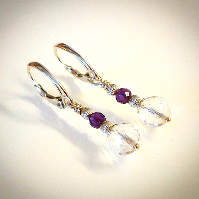 Strieborné náušničky sú ručne vyrobené zo šperkového striebra (925/1000) a z prírodných korálok z kryštálu a ametystu.