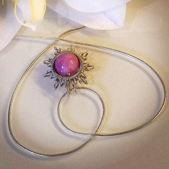 Tento originálny strieborný prívesok v tvare kvietku, je ručne vyrobený zo šperkového striebra 925/1000 a z korálky z prírodného ružového Angelitu. Veľkosť korálky je 0,8 mm a veľkosť prívesku 2 x 1,9 cm. Prívesok je vyrobený technikou wire-wrapping (drôtikovanie).