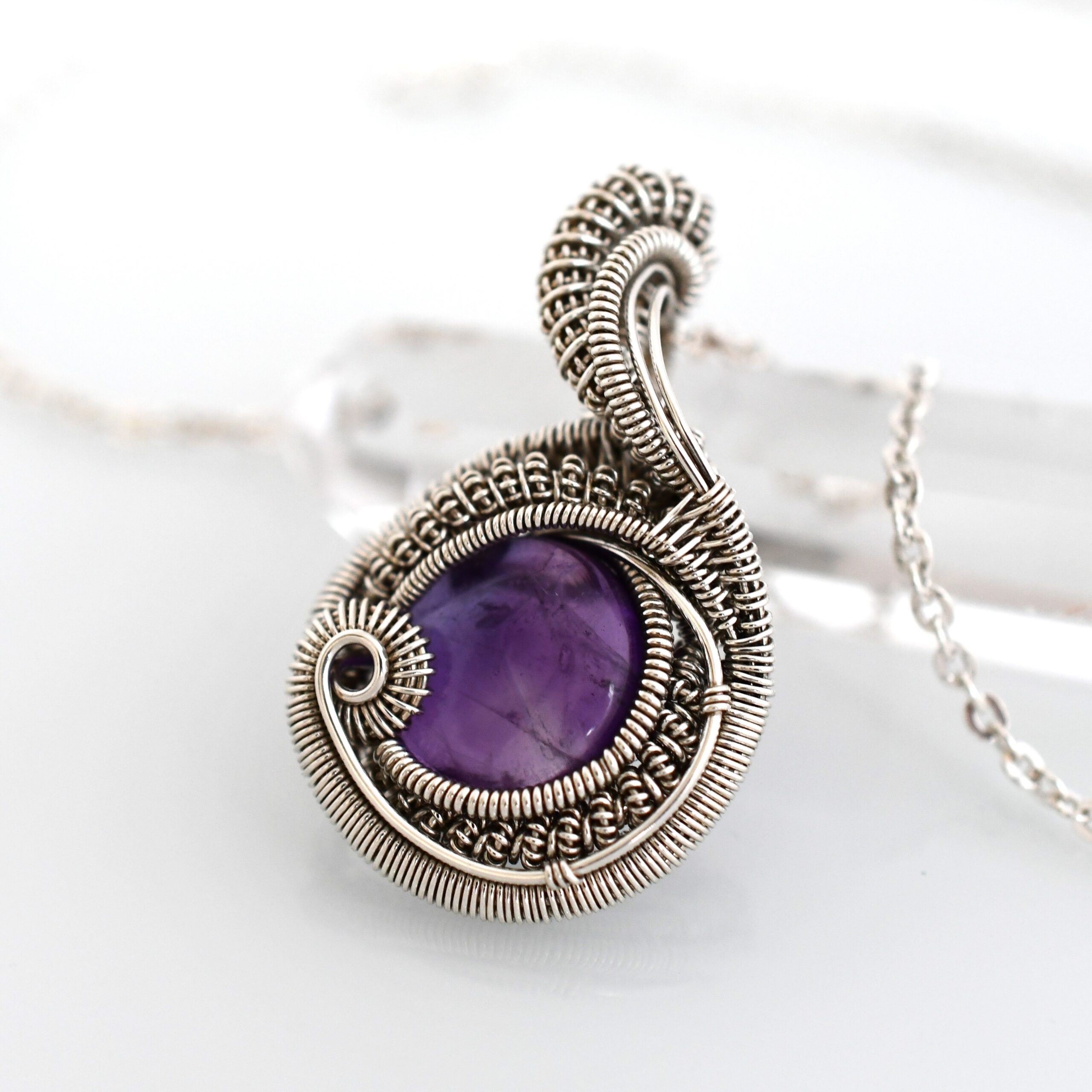 Strieborný prívesok je ručne vyrobený zo šperkového striebra (925/1000) a z prírodného Ametystu. Prívesok je vyrobený technikou wire-wrapping (drôtikovanie).