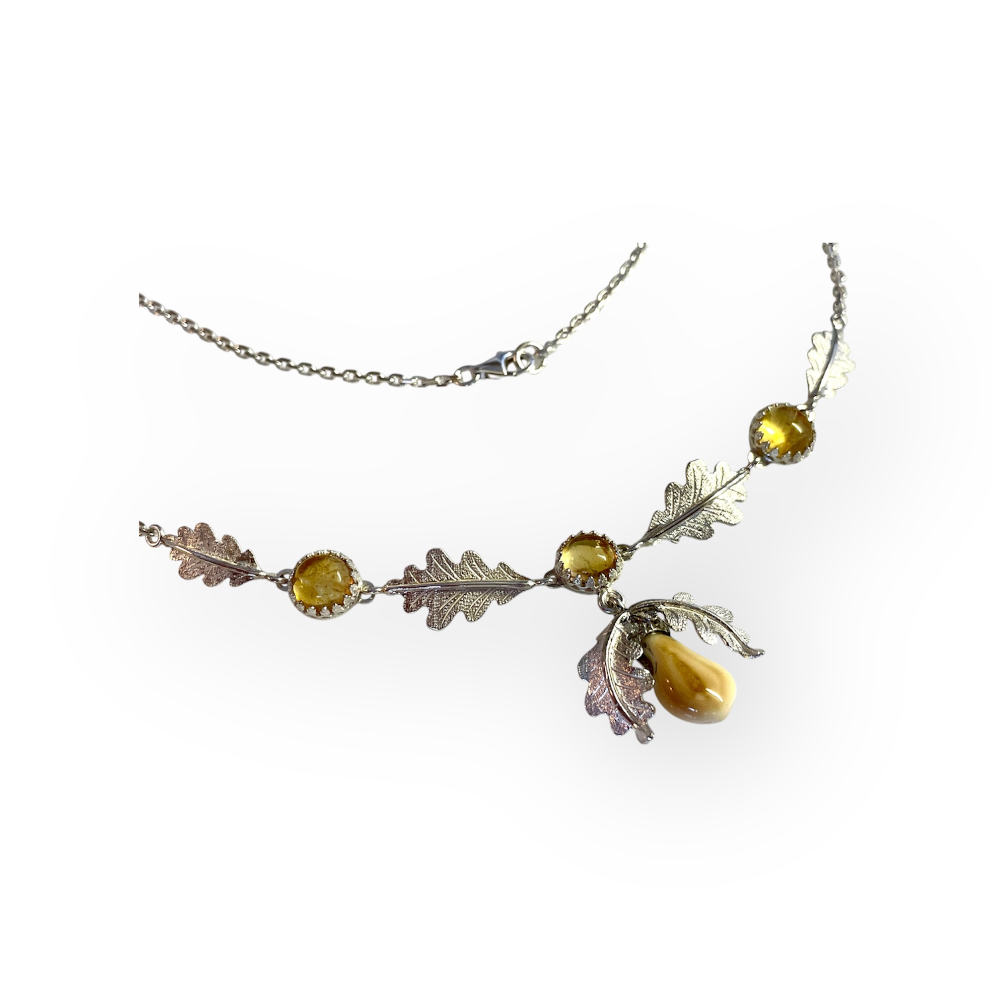 Strieborný náhrdelník má dĺžku 50 cm, a zdobia ho precízne vypracované dubové lístky, ktoré symbolizujú silu a odolnosť. Tri prírodné citríny v ozdobných strieborných obrubách dodávajú náhrdelníku jemnú iskru a zlatistý nádych.