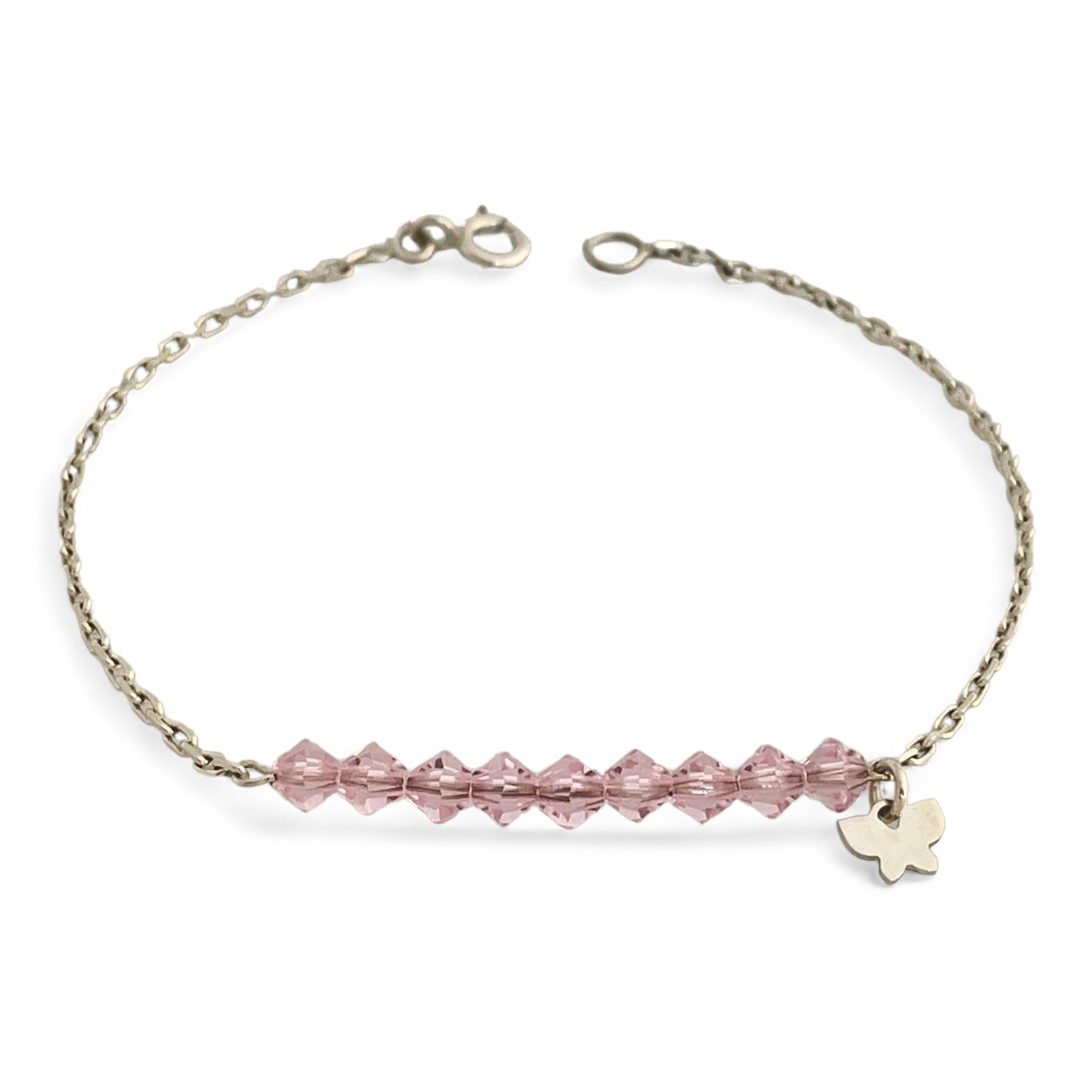 Náramok je ručne vyrobený zo šperkového striebra 925/1000 a zdobia ho sklenené korálky ružovej farby.