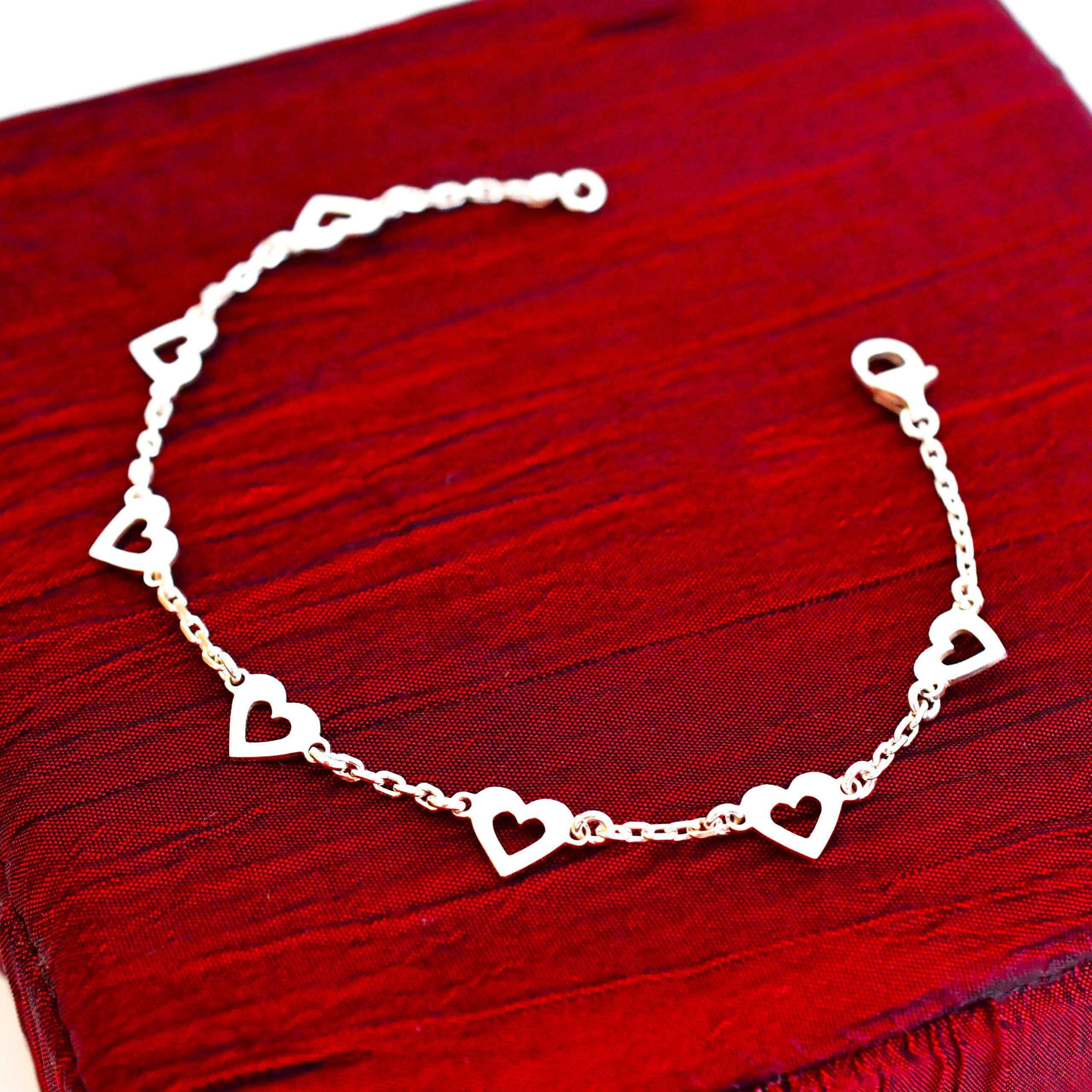 Prijmite esenciu lásky a elegancie s naším nádherným strieborným retiazkovým náramkom s jemnými vypílenými srdiečkami.