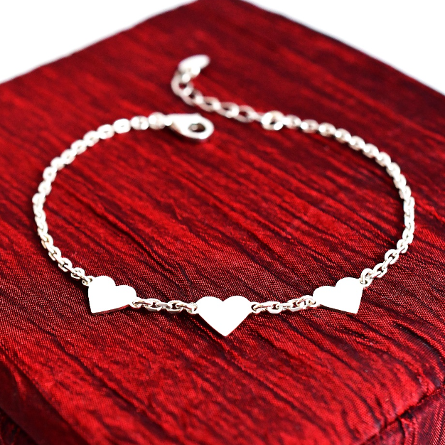 Strieborný náramok s tromi srdiečkami je ručne vyrobený zo šperkového striebra 925/1000.