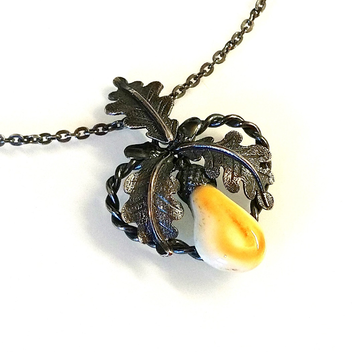 Prívesok tvorí srdce zo spletených strieborných drôtikov, ktoré zdobí žaluď s dubovými lístkami a jeleňou grandľou.