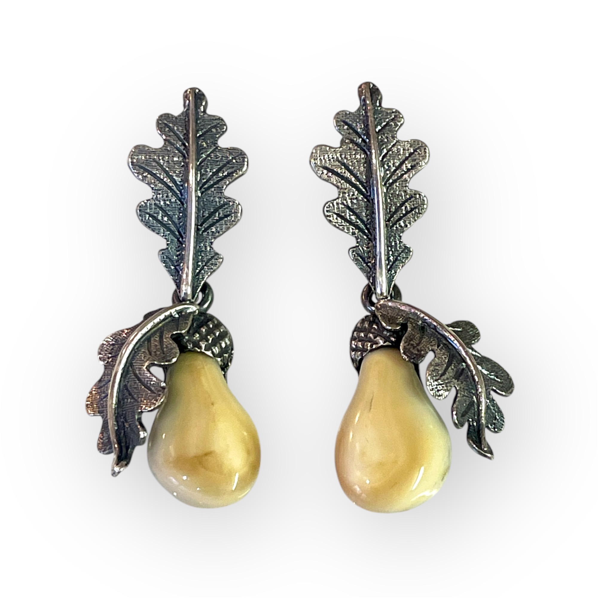 Dominantou náušníc je precízne spracovaná ozdoba v tvare žaluďa, ktorú zdobí detailný dubový lístok. V centre sa nachádza pravá jelenia grandľa (jelení zub), ktorá dodáva šperku jedinečný a prírodný charakter. Táto ozdoba je zavesená na ďalšom ručne tvarovanom dubovom lístku, na ktorom je umiestnené zapínanie náušníc.